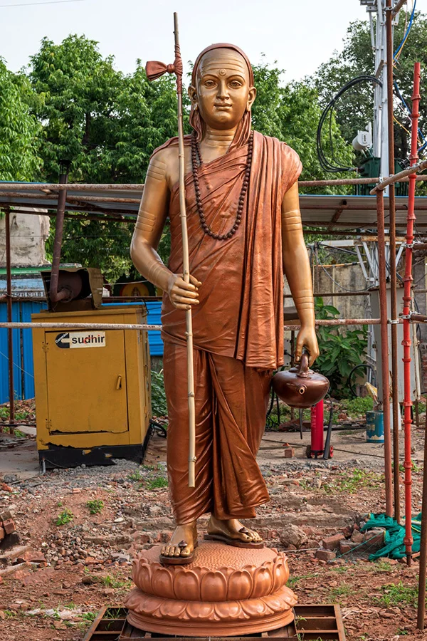 아디 샹카라(788-820)는 "브라흐만과 아트만은 하나다"라는 철학적 사상을 주창하며, 우주의 최고 실체인 "브라흐만"이 본질적으로 개인의 영혼인 "아트만"과 동일하다고 믿었습니다. 이 심오한 개념을 반영하기 위해 장시 통칭 디자인 팀은 샹카라의 "브라흐마 수트라 주석서"를 심도 있게 연구하고 철학적 함의를 시각적 언어로 구현했습니다. 조각상은 명상하는 자세로 표현되어 "브라흐만"의 궁극적 실현을 상징합니다. 얼굴 표정은 엄숙하고 초연하며, 눈을 아래로 내리고 손바닥을 응시하는데, 이는 "자아 성찰"의 수행과 일맥상통합니다. 옷주름은 인도 전통 의복인 "사리"의 나선형 패턴을 차용했지만, 흐르는 듯한 금속 선으로 재구성하여 문화적 상징성을 유지하는 동시에 현대 조각에 역동적인 아름다움을 부여합니다.
